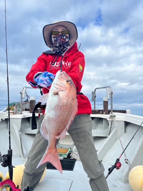 ここ最近、小魚が近場から消えた為、大好きなジギングゲームが成立しないので今日は思考を変え久しぶりにテンヤゲームをやって来ました♪強風で少し波立っていましたが相方、うまい事ターゲットにアプローチできてるようでアタリはそれなりに多く短時間ではありましたが1.5kクラスの良型真鯛、60クラスのマゴチなどの姿がみれた状況でありました。当船、活きエビ(オオダエビ)の入荷が可能です。これからのテンヤゲーム・エビラバ等で活きエビが必要なお客様はご連絡ください。活きエビは1~2名分(3000円)、3~4名分(6000円)でご準備できます。冷凍エビよりエサ持ちもよく喰いも断然よいです。ご興味あればテンヤゲーム(天草テンヤ・一つテンヤ等)挑戦してみらんですか?本命の真鯛もいいけどコチやヒラメが嬉しいゲストの場合があり五目釣りがしばらくは楽しめそうです。