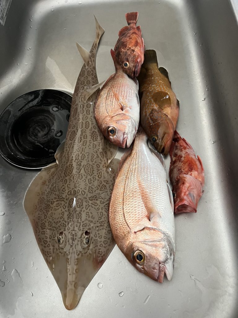 出れそうな風であっても小型の船でのガイド、安全を第一に営業しております。予約を入れていただいたお客様には大変、申し訳なく思いますが自然相手のレジャー、ここはグッと我慢し梅雨明けてから挽回したい思いでいっぱいです💦こんな感じで今週もガイドがお休みとなってしまいましたので、その時間を利用して21日、土曜日は船のエンジン場の掃除に各所のチェックを行い。22日、日曜日は燃料補給ついでに釣具屋でオオダエビ150グラム(オオダも高いんですよねw我が家の食材調達班長嫁一人分のチョイ釣り分150グラムですw)買って風裏で食料調達兼ねて近場の五目釣り調査やってみましたが飽きない程度にアタリはあり数日分の食材は確保できました。食材調達目的時は竿一本の一人釣りで餌も少量で充分で、こんな時、私は釣りよりも魚探見ながら嫁の釣り見て楽しんでおりますw釣果は短時間ではありましたが、ありがたいことに小型の真鯛、アコウ、カサゴ、サカタザメ、その他ベラなどがあがりました。今回のラッキーフィッシュは見た目が悪いサカタザメ(ごめんよサカタザメw)私はこれを味噌煮やニンニク醤油に少々漬け込み竜田揚げこれが実に旨しwで大好きです💕臭みなどなく特に揚げると鶏肉に近い感覚でマヨ付けると最高~🤤ご飯が進む最高のオカズ🐟となるんです♪また太りそうですw
